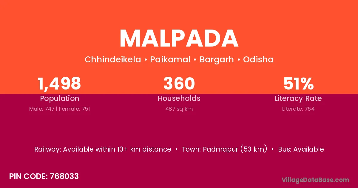 Tarbha (29 km) is the nearest town to Malpada village for major economic activities and is located approximately 29 km away.