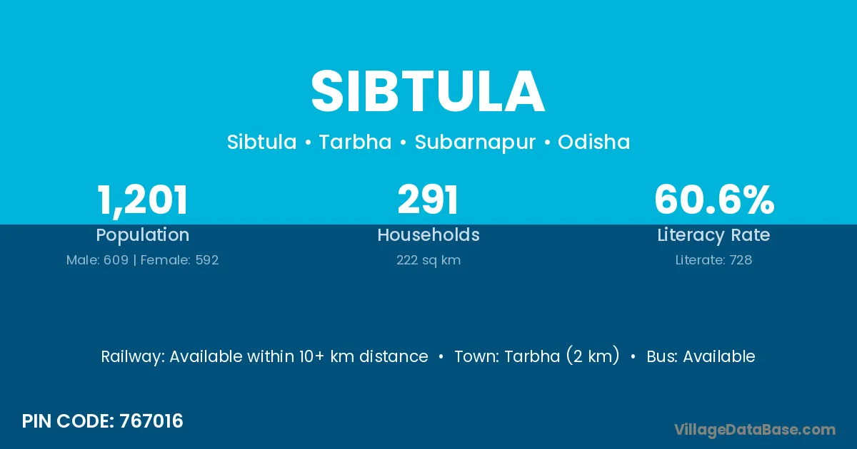 Sibtula village has a total population of 1,201 people, of which 609 are males and 592 are females.