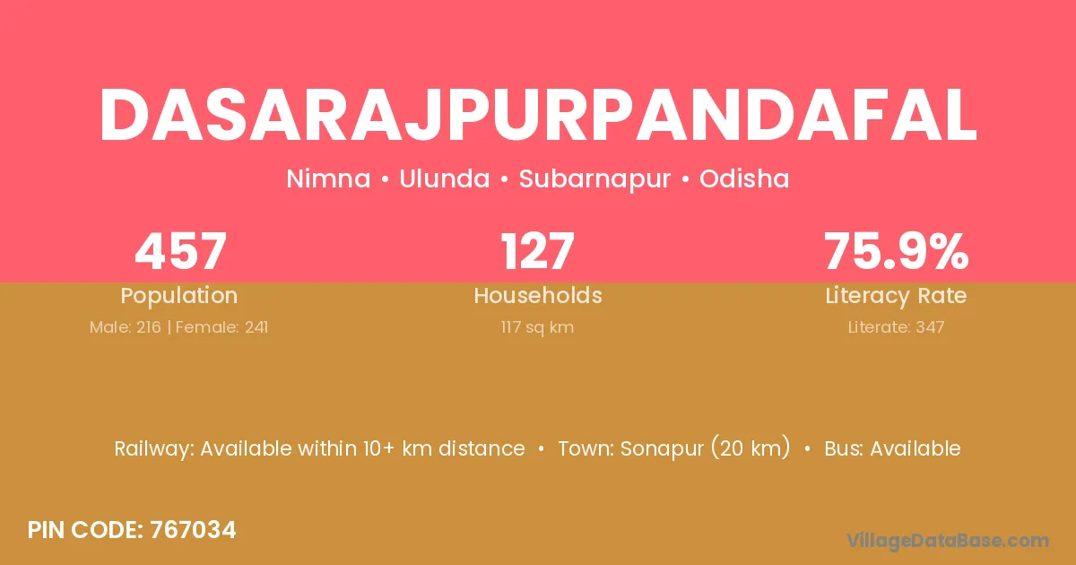 Sonapur (20 km) is the nearest town to Dasarajpurpandafal village for major economic activities and is located approximately 20 km away.