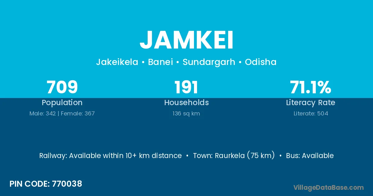 Raurkela (75 km) is the nearest town to Jamkei village for major economic activities and is located approximately 75 km away.