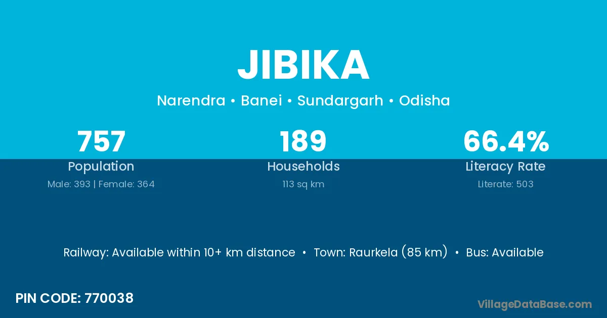 Raurkela (85 km) is the nearest town to Jibika village for major economic activities and is located approximately 85 km away.