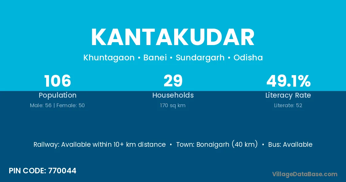 Bonaigarh (40 km) is the nearest town to Kantakudar village for major economic activities and is located approximately 40 km away.