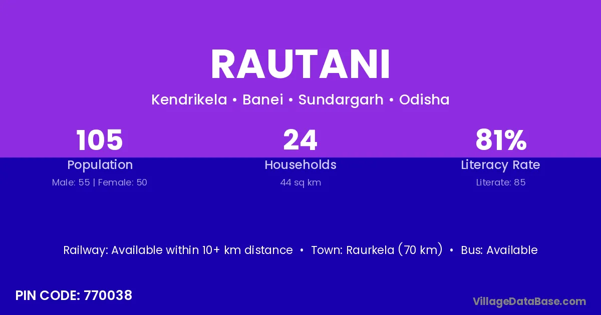 Raurkela (70 km) is the nearest town to Rautani village for major economic activities and is located approximately 70 km away.
