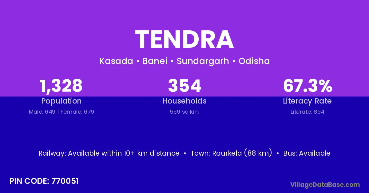 Raurkela (88 km) is the nearest town to Tendra village for major economic activities and is located approximately 88 km away.