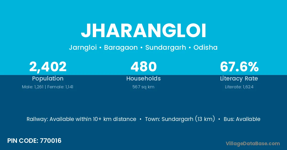 Sundargarh (13 km) is the nearest town to Jharangloi village for major economic activities and is located approximately 13 km away.