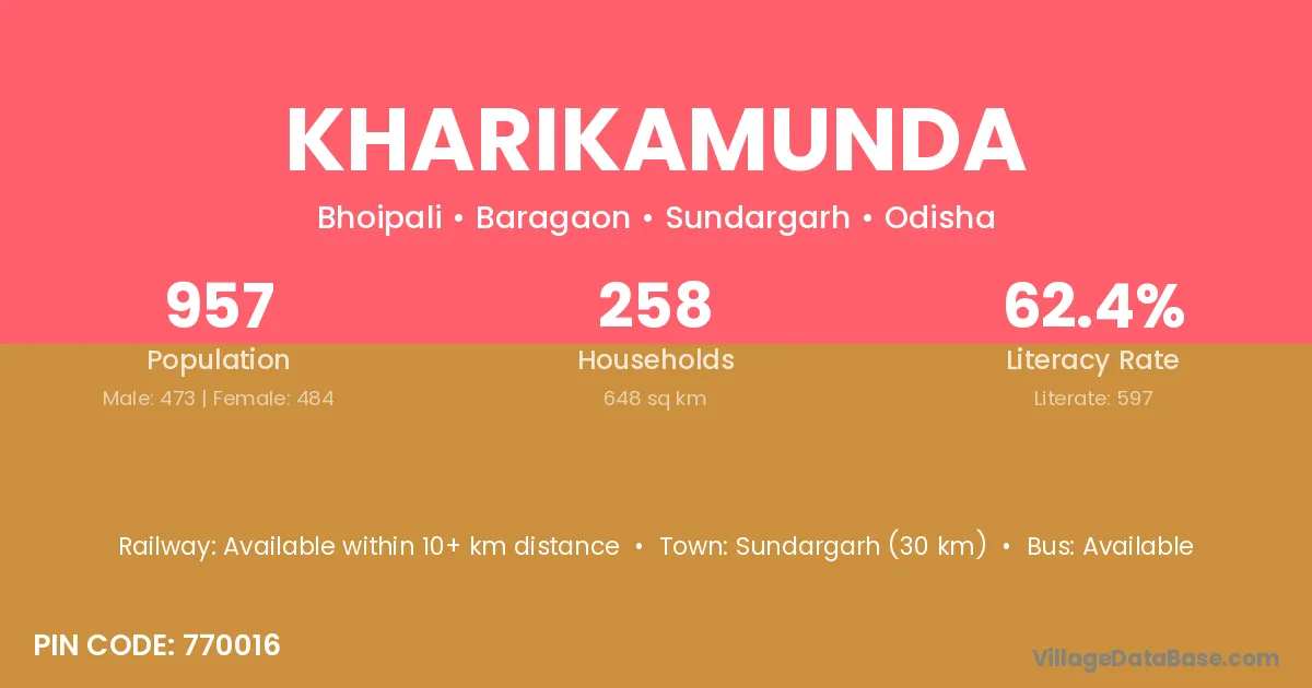 Kharikamunda village has a total population of 957 people, of which 473 are males and 484 are females.