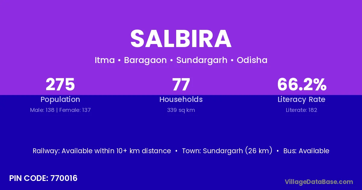 Sundargarh (26 km) is the nearest town to Salbira village for major economic activities and is located approximately 26 km away.