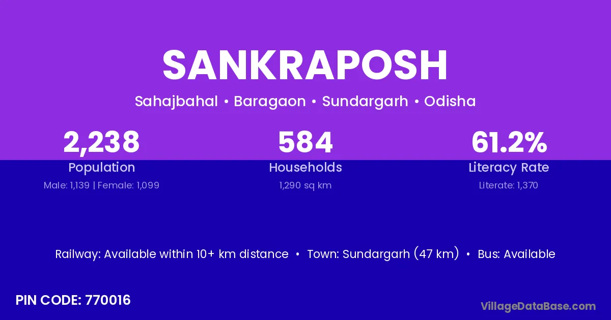 Sundargarh (47 km) is the nearest town to Sankraposh village for major economic activities and is located approximately 47 km away.