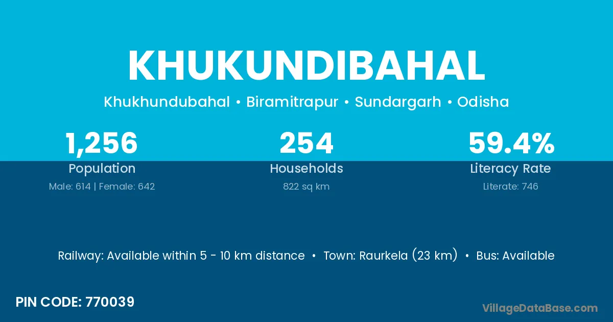 Raurkela (23 km) is the nearest town to Khukundibahal village for major economic activities and is located approximately 23 km away.