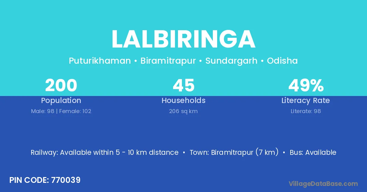 Lalbiringa village has a total population of 200 people, of which 98 are males and 102 are females.