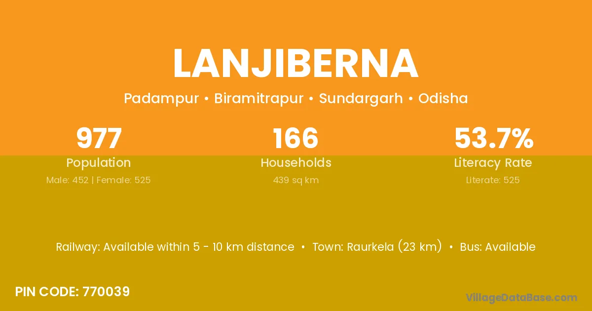 Raurkela (23 km) is the nearest town to Lanjiberna village for major economic activities and is located approximately 23 km away.