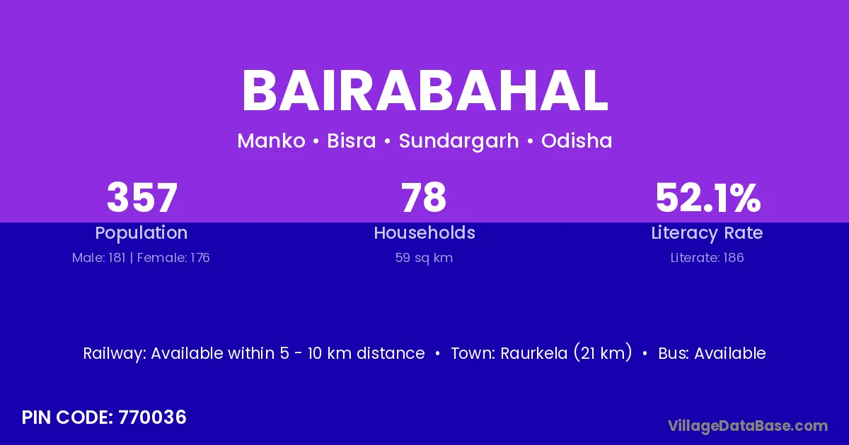 Raurkela (21 km) is the nearest town to Bairabahal village for major economic activities and is located approximately 21 km away.