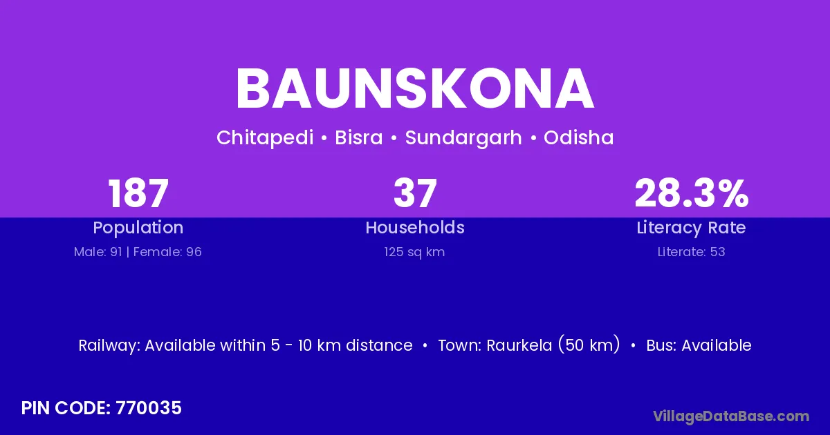 Raurkela (50 km) is the nearest town to Baunskona village for major economic activities and is located approximately 50 km away.