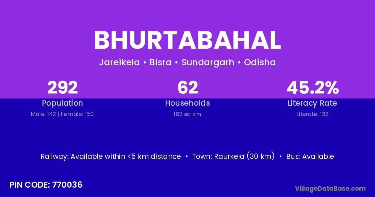 Raurkela (30 km) is the nearest town to Bhurtabahal village for major economic activities and is located approximately 30 km away.