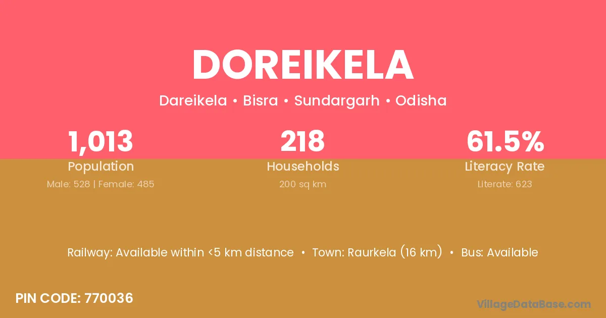 Raurkela (16 km) is the nearest town to Doreikela village for major economic activities and is located approximately 16 km away.