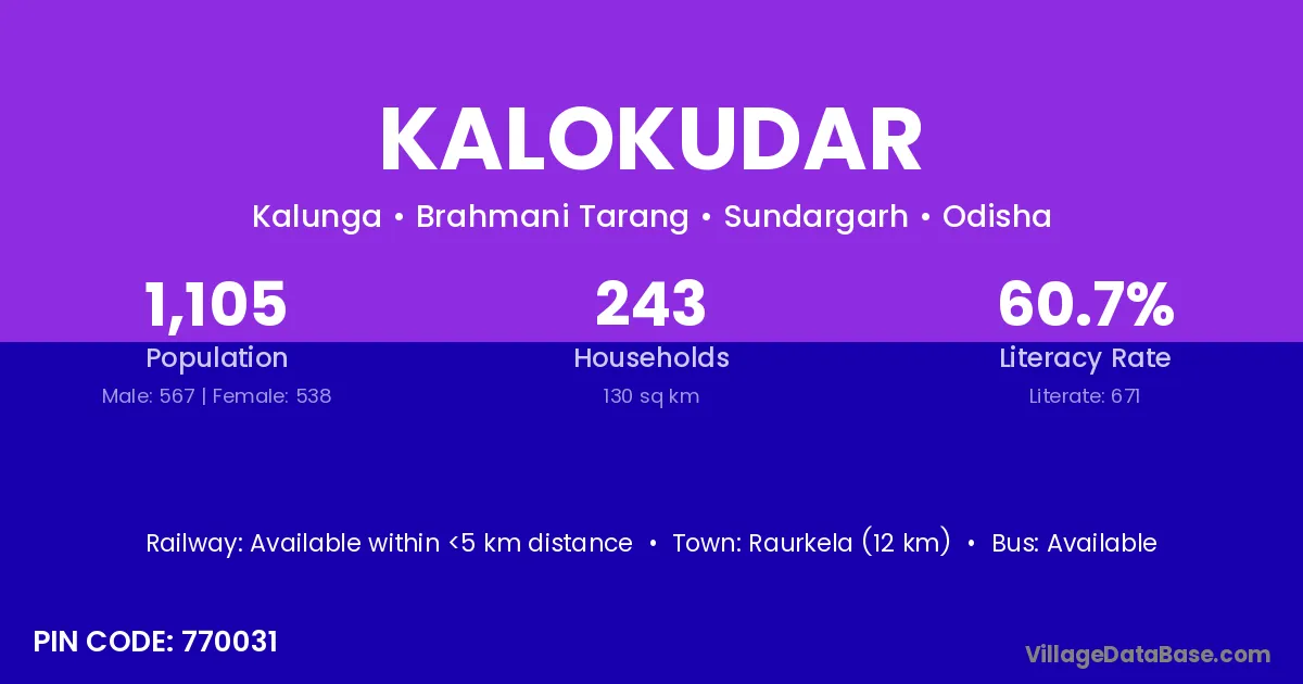 Raurkela (12 km) is the nearest town to Kalokudar village for major economic activities and is located approximately 12 km away.