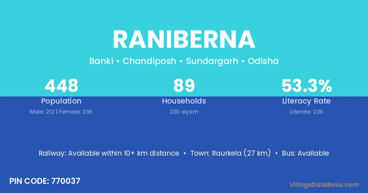 Raurkela (27 km) is the nearest town to Raniberna village for major economic activities and is located approximately 27 km away.