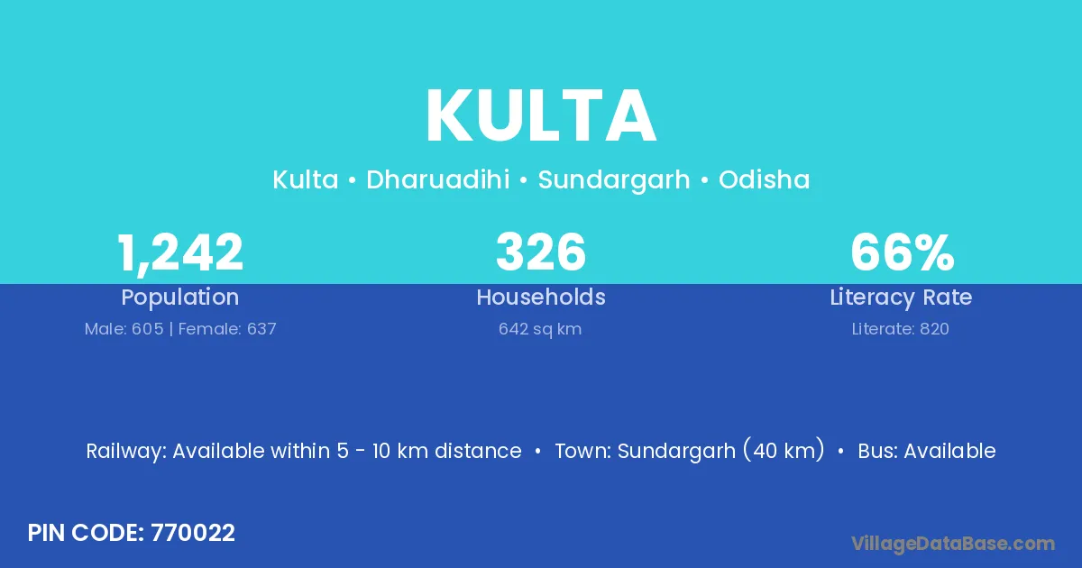 Sundargarh (40 km) is the nearest town to Kulta village for major economic activities and is located approximately 40 km away.