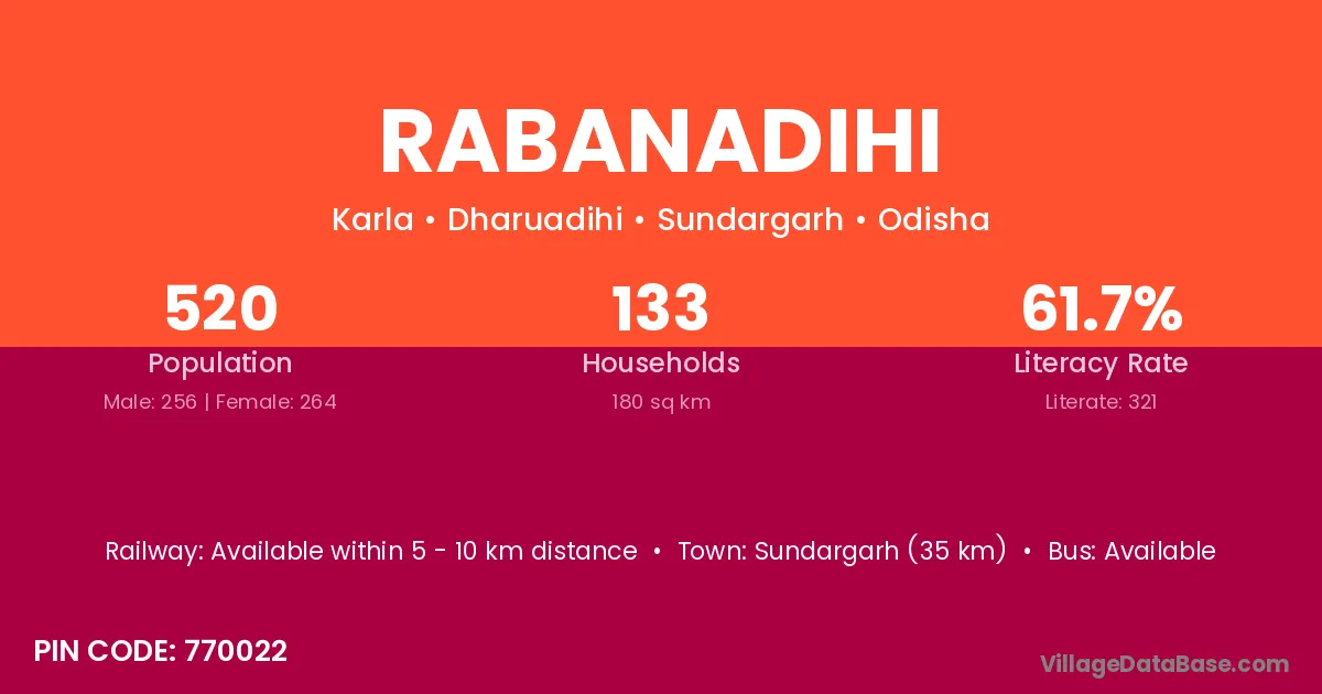 Sundargarh (35 km) is the nearest town to Rabanadihi village for major economic activities and is located approximately 35 km away.