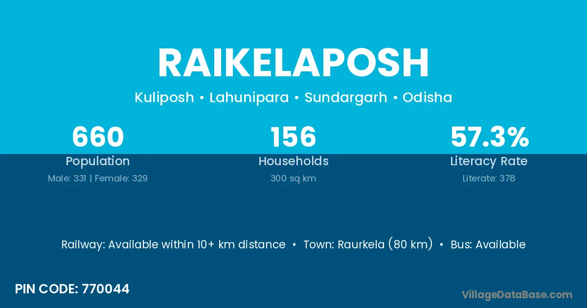 Raurkela (74 km) is the nearest town to Raikelaposh village for major economic activities and is located approximately 74 km away.
