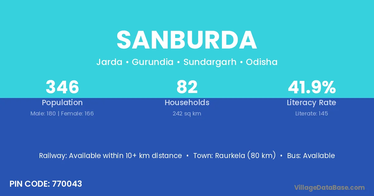 Raurkela (80 km) is the nearest town to Sanburda village for major economic activities and is located approximately 80 km away.