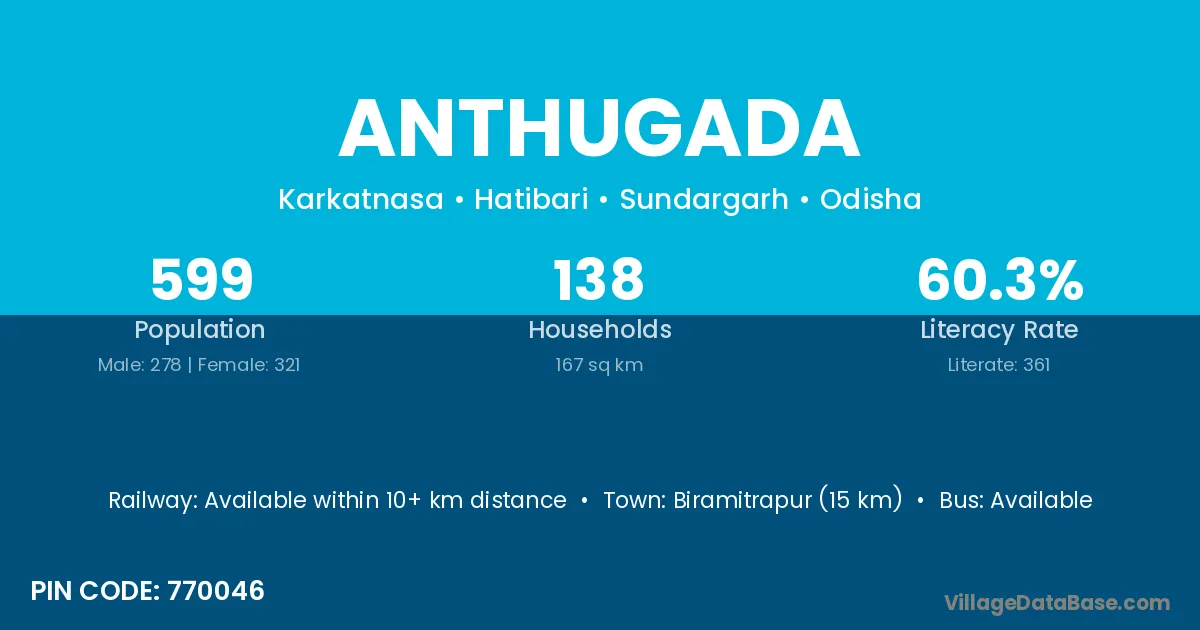 Biramitrapur (15 km) is the nearest town to Anthugada village for major economic activities and is located approximately 15 km away.