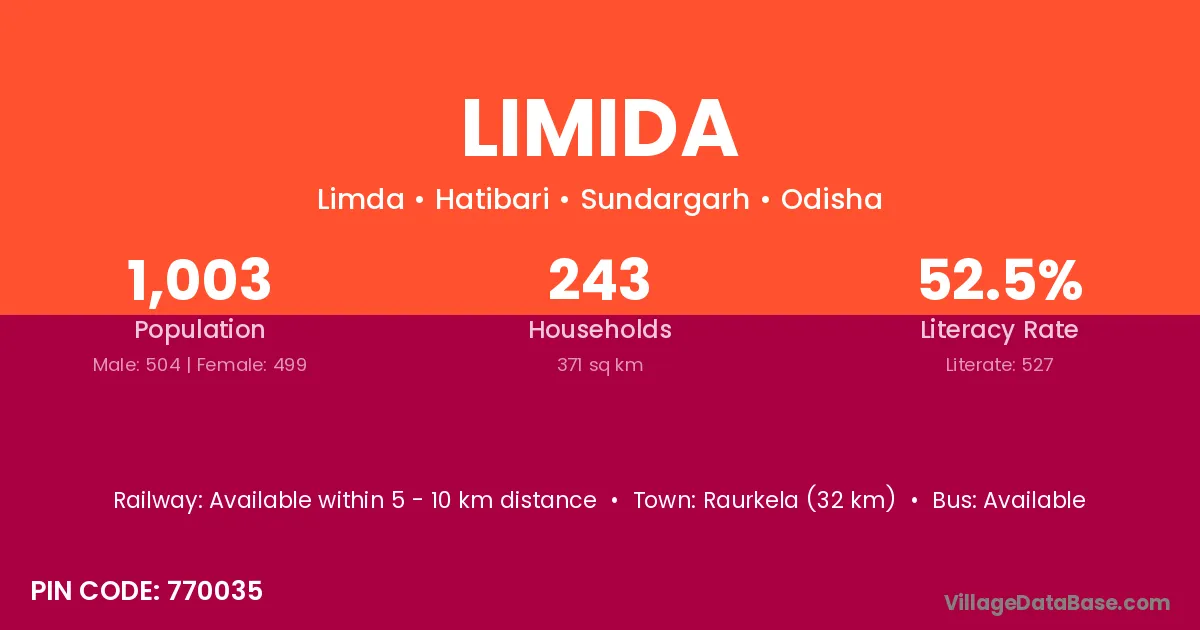 Raurkela (32 km) is the nearest town to Limida village for major economic activities and is located approximately 32 km away.