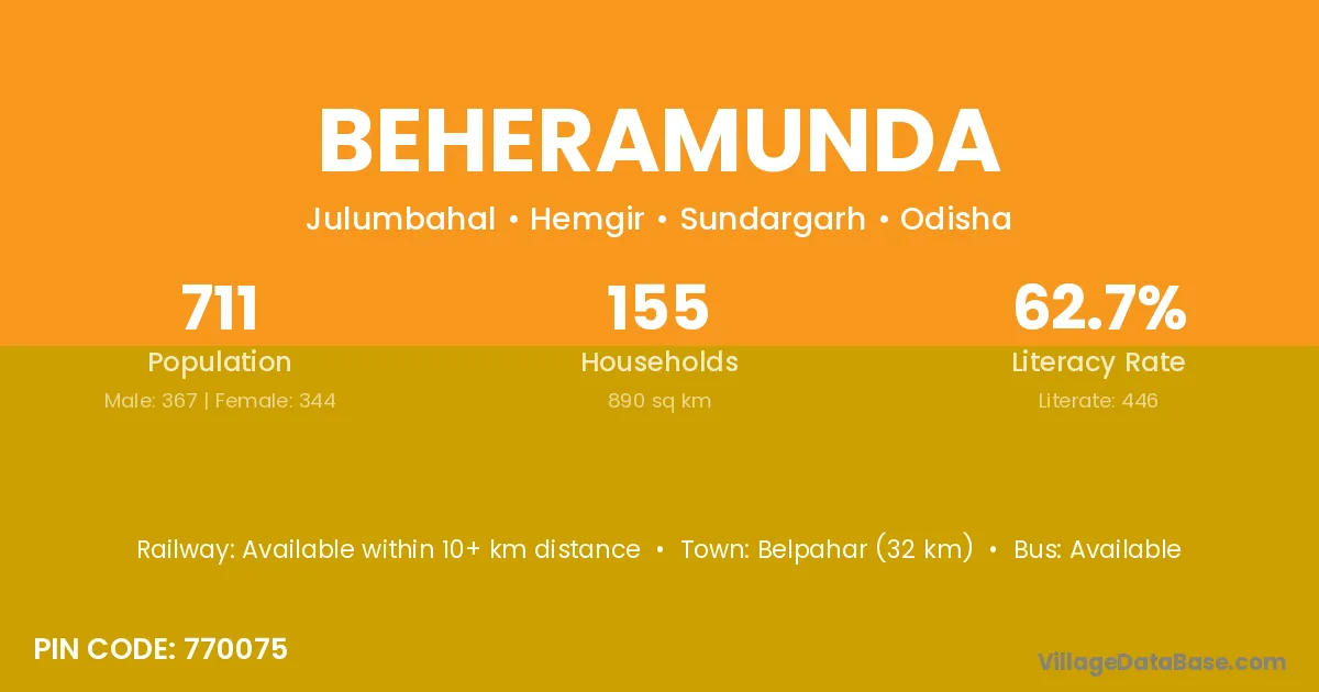 Belpahar (32 km) is the nearest town to Beheramunda village for major economic activities and is located approximately 32 km away.