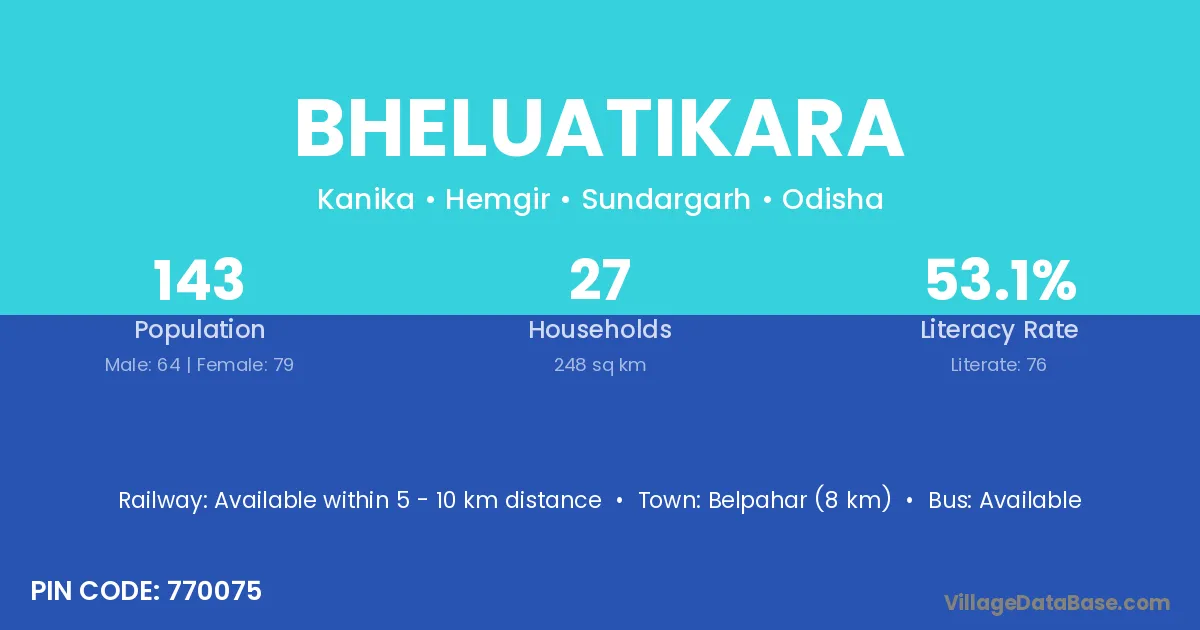 Bheluatikara village has a total population of 143 people, of which 64 are males and 79 are females.