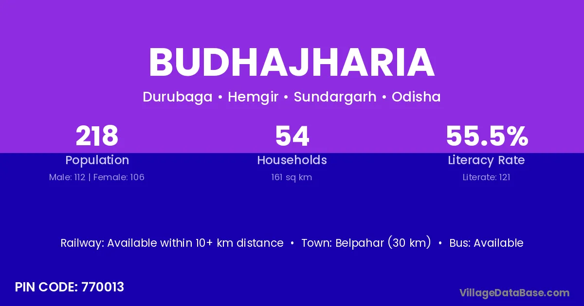 Belpahar (30 km) is the nearest town to Budhajharia village for major economic activities and is located approximately 30 km away.