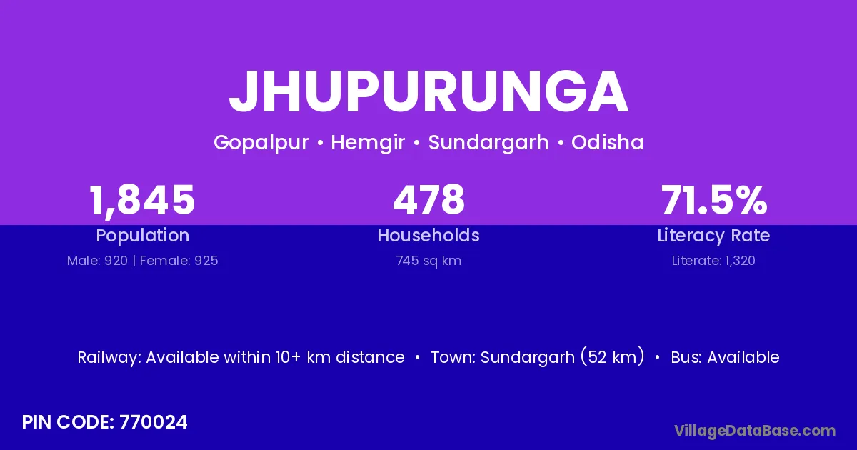 Sundargarh (52 km) is the nearest town to Jhupurunga village for major economic activities and is located approximately 52 km away.