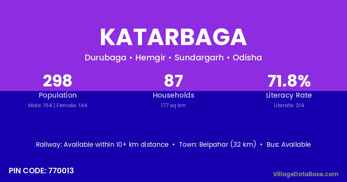 Belpahar (32 km) is the nearest town to Katarbaga village for major economic activities and is located approximately 32 km away.