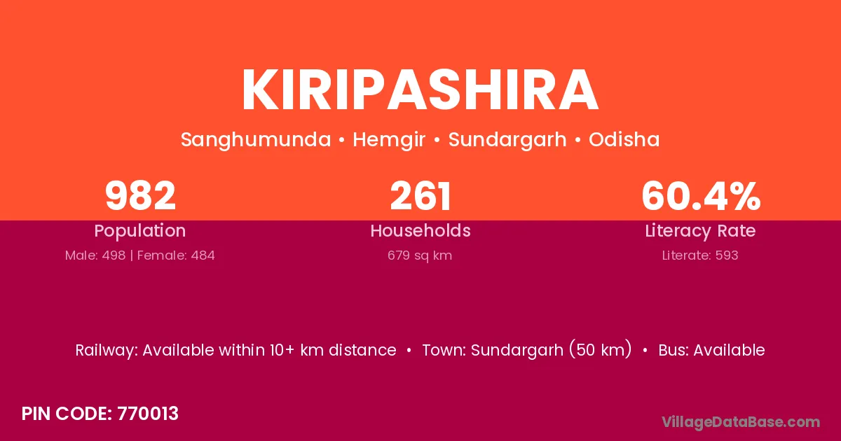 Kiripashira village has a total population of 982 people, of which 498 are males and 484 are females.