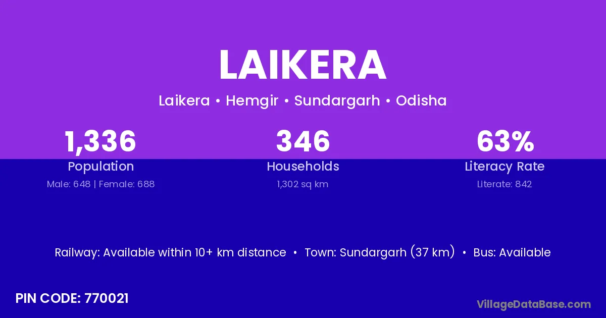 Sundargarh (37 km) is the nearest town to Laikera village for major economic activities and is located approximately 37 km away.