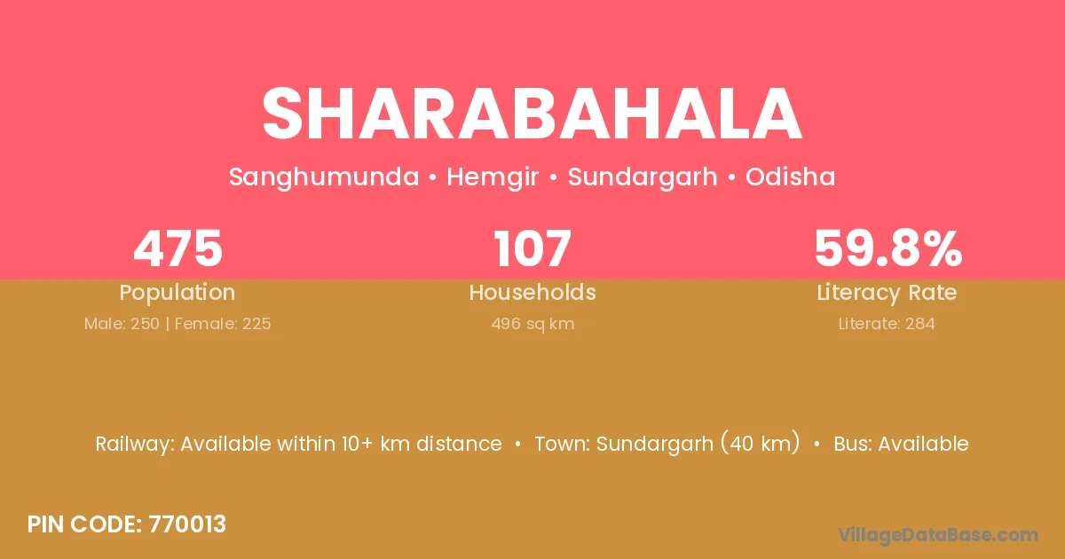Sundargarh (40 km) is the nearest town to Sharabahala village for major economic activities and is located approximately 40 km away.