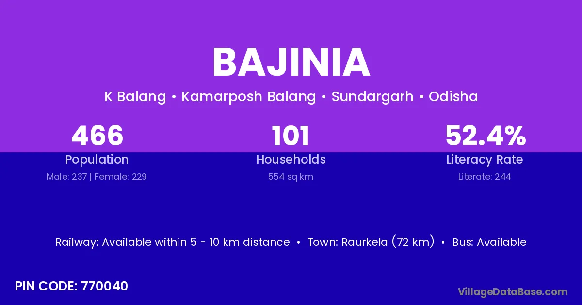 Raurkela (72 km) is the nearest town to Bajinia village for major economic activities and is located approximately 72 km away.