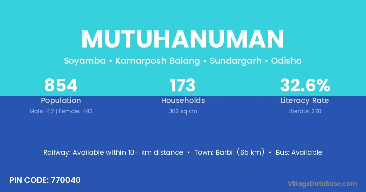 Barbil (65 km) is the nearest town to Mutuhanuman village for major economic activities and is located approximately 65 km away.