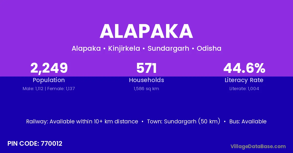 Sundargarh (50 km) is the nearest town to Alapaka village for major economic activities and is located approximately 50 km away.