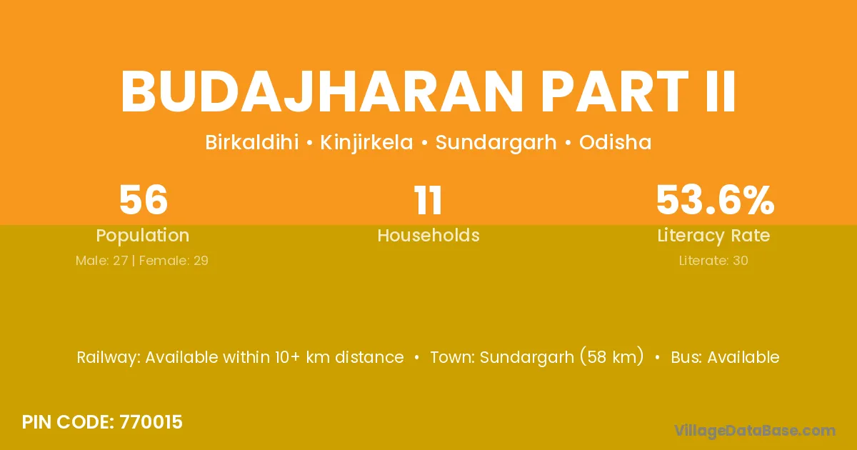 Sundargarh (58 km) is the nearest town to Budajharan Part Ii village for major economic activities and is located approximately 58 km away.