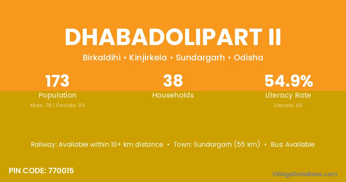 Sundargarh (55 km) is the nearest town to Dhabadolipart Ii village for major economic activities and is located approximately 55 km away.