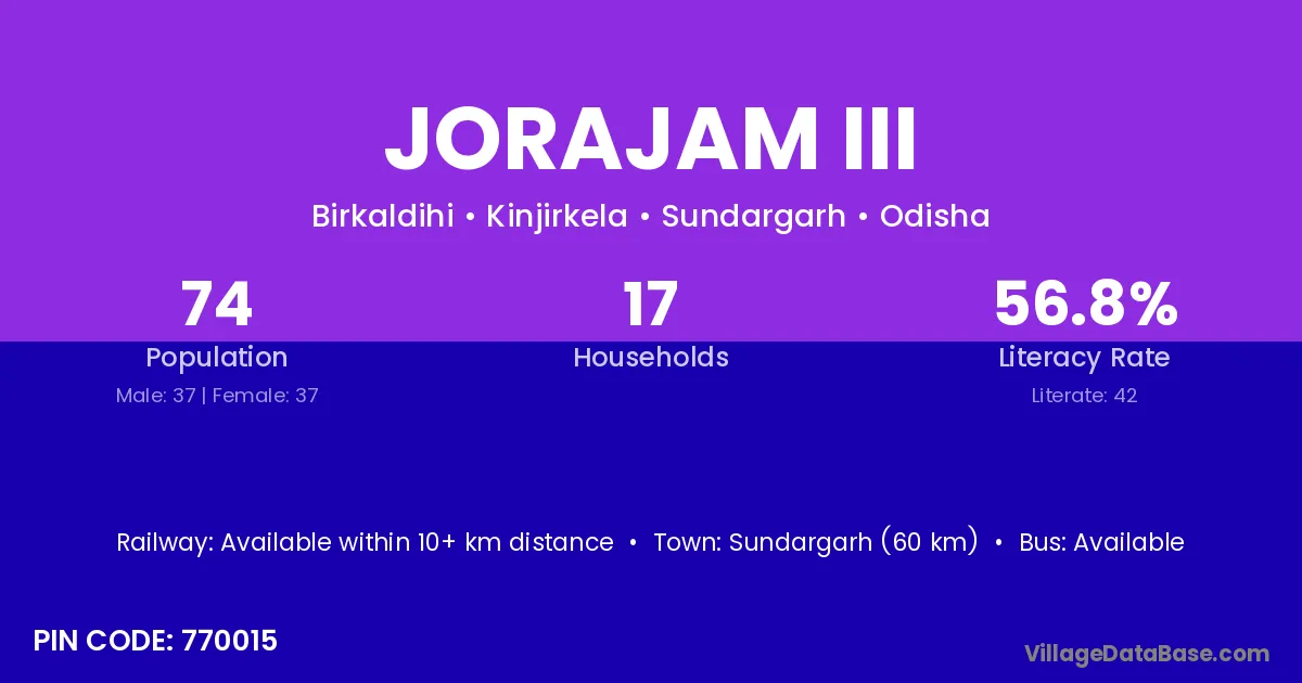 Sundargarh (60 km) is the nearest town to Jorajam Iii village for major economic activities and is located approximately 60 km away.