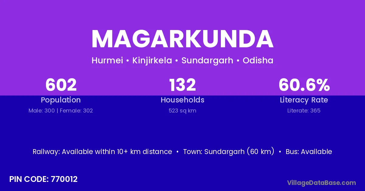Sundargarh (60 km) is the nearest town to Magarkunda village for major economic activities and is located approximately 60 km away.
