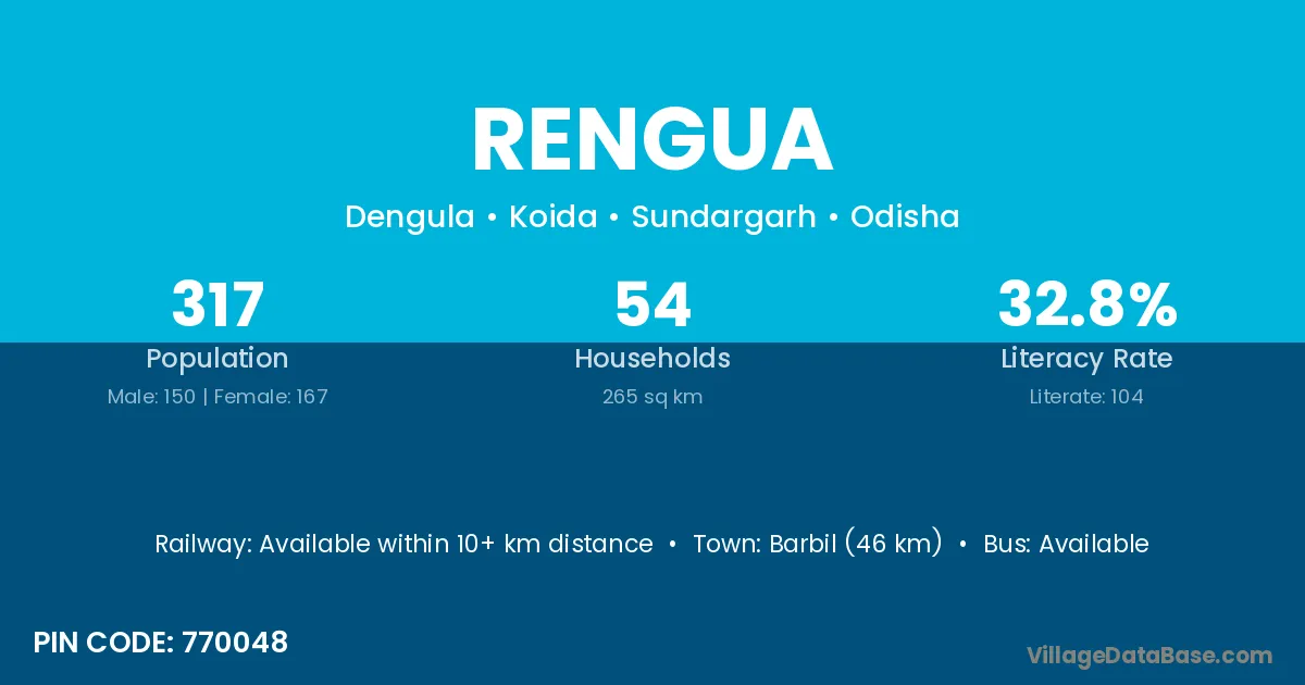 Barbil (46 km) is the nearest town to Rengua village for major economic activities and is located approximately 46 km away.
