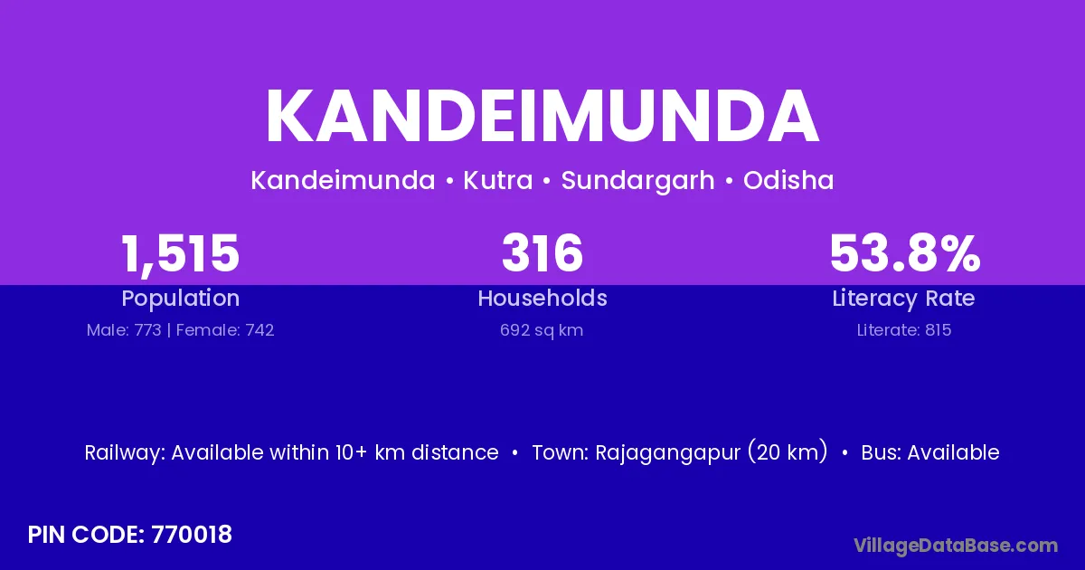 Kandeimunda village has a total population of 1,515 people, of which 773 are males and 742 are females.