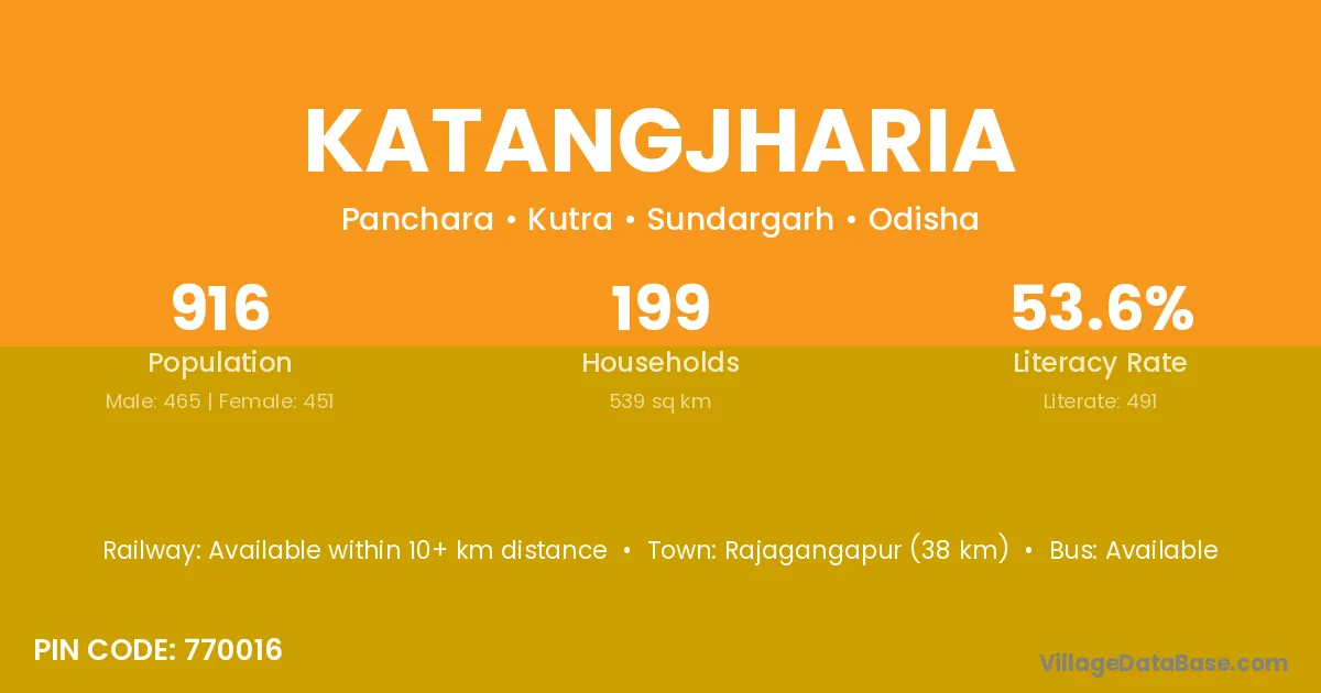 Rajagangapur (38 km) is the nearest town to Katangjharia village for major economic activities and is located approximately 38 km away.