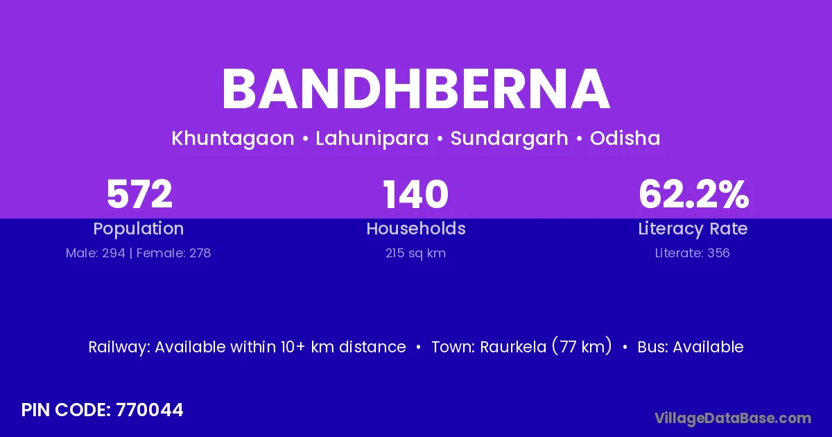 Raurkela (77 km) is the nearest town to Bandhberna village for major economic activities and is located approximately 77 km away.