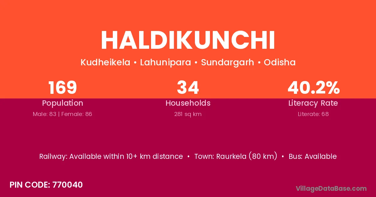 Raurkela (80 km) is the nearest town to Haldikunchi village for major economic activities and is located approximately 80 km away.
