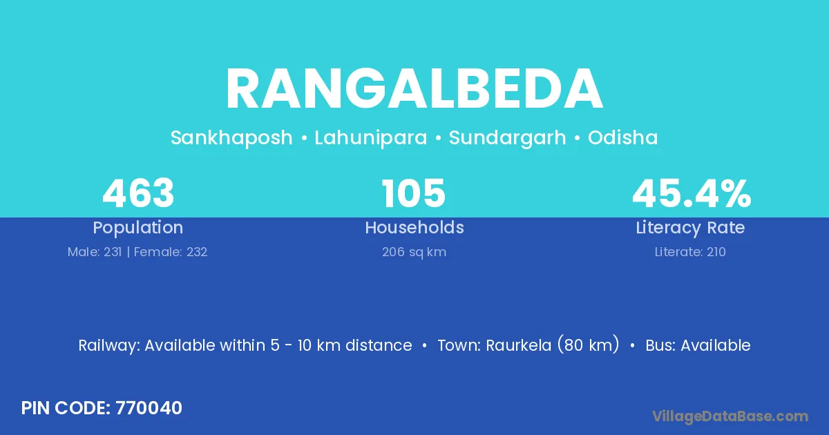 Raurkela (80 km) is the nearest town to Rangalbeda village for major economic activities and is located approximately 80 km away.