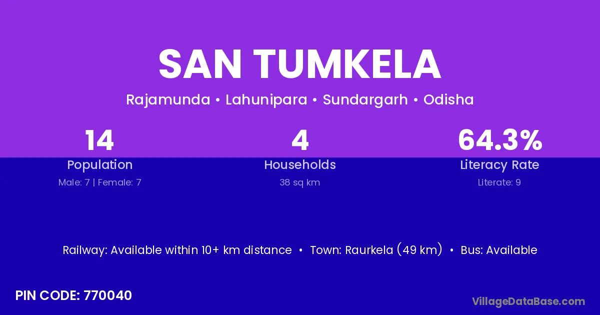San Tumkela village has a total population of 14 people, of which 7 are males and 7 are females.