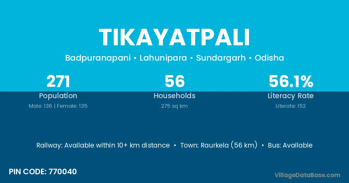 Tikayatpali village has a total population of 271 people, of which 136 are males and 135 are females.
